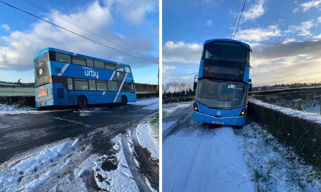 The Ulsterbus, driving along the Bannfoot Road, Derrytrasna, ended up in a very precarious and potentially life-threatening situation on Monday (January 5) when frosty, ungritted roads caused it to skid into the grass verge.