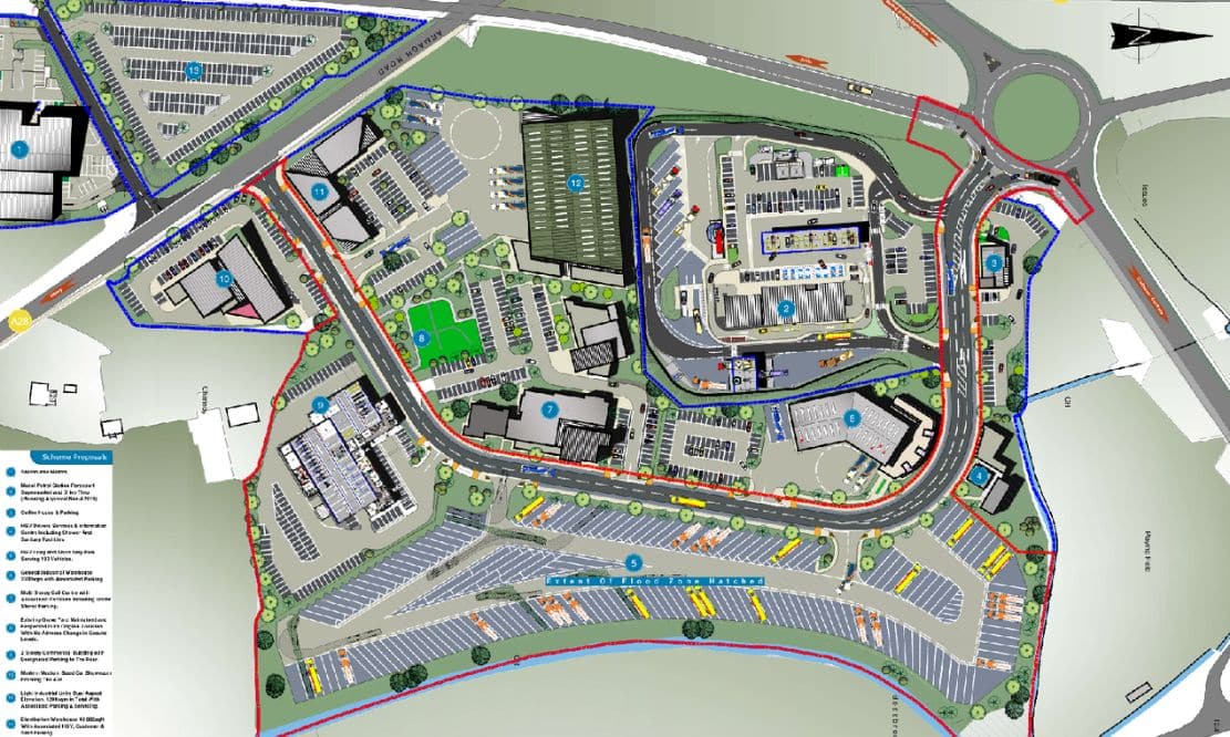 Among the scheme proposals, permission is being sought for the construction of a Maxol Petrol Station Forecourt Supermarket and Drive-Thru (which was granted approval as part of a separate application in November 2019) and a coffee house and parking that would each occupy the North East corner of the site and be immediately accessible from the Armagh Road roundabout.