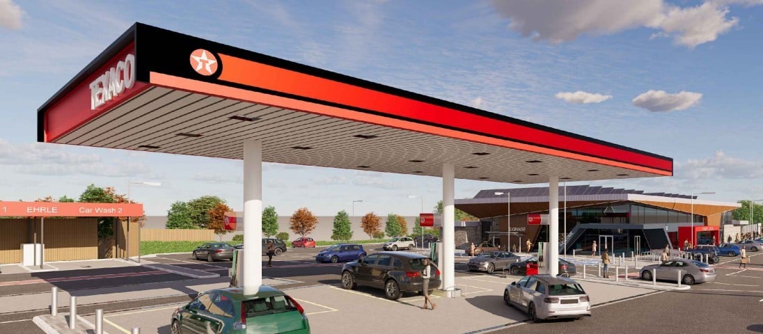 The proposed re-development of the existing filling station includes the conversion of existing convenience retail floorspace to a farm hardware supplies shop; the erection of a new off-site supermarket building to the north-west of the site; the removal of the existing canopy, and erection of a new forecourt and canopy and fuel pumps; bunkering facilities; EV charging facilities; a substation; lighting; new site access with parking, drainage, and all associated siteworks.