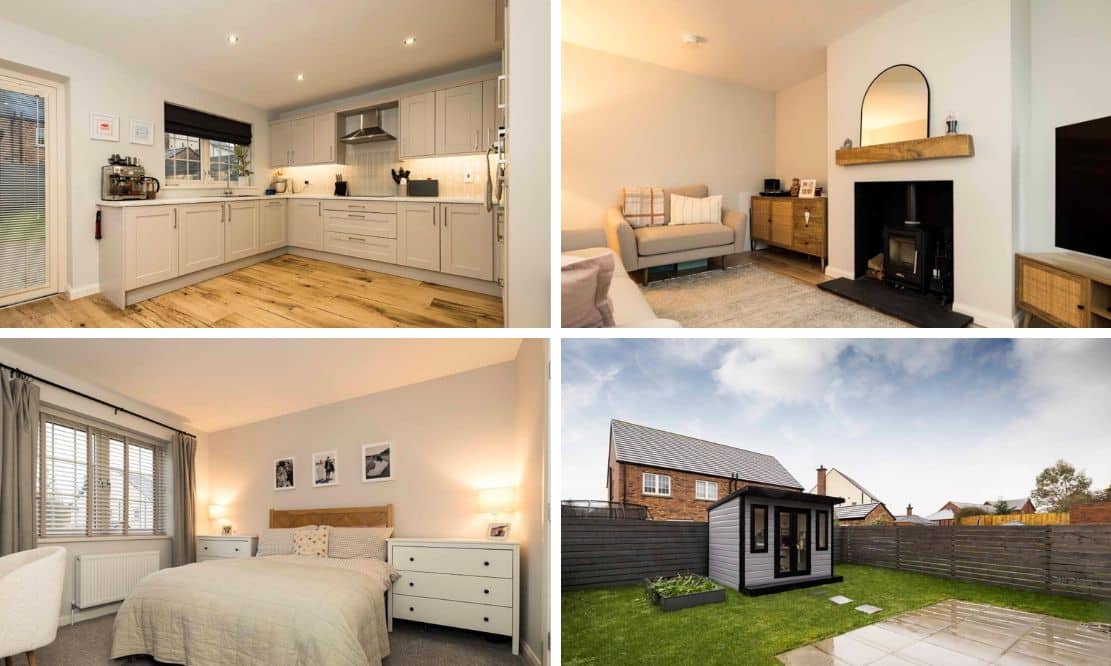 Relax in the spacious living room, with multi fuel stove and beam mantle detail as the focal point, whilst the front aspect is towards the Green within the development. The kitchen is open plan to dining with an excellent range of high and low level storage units, complimented by an array of integrated appliances. Patio doors lead out onto the garden. A WC completes the ground floor.