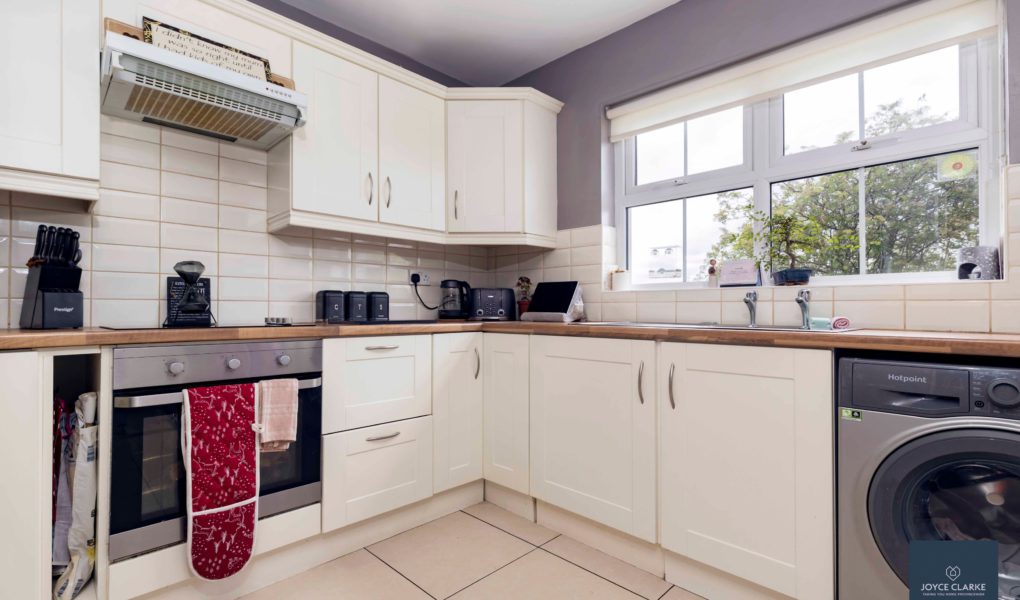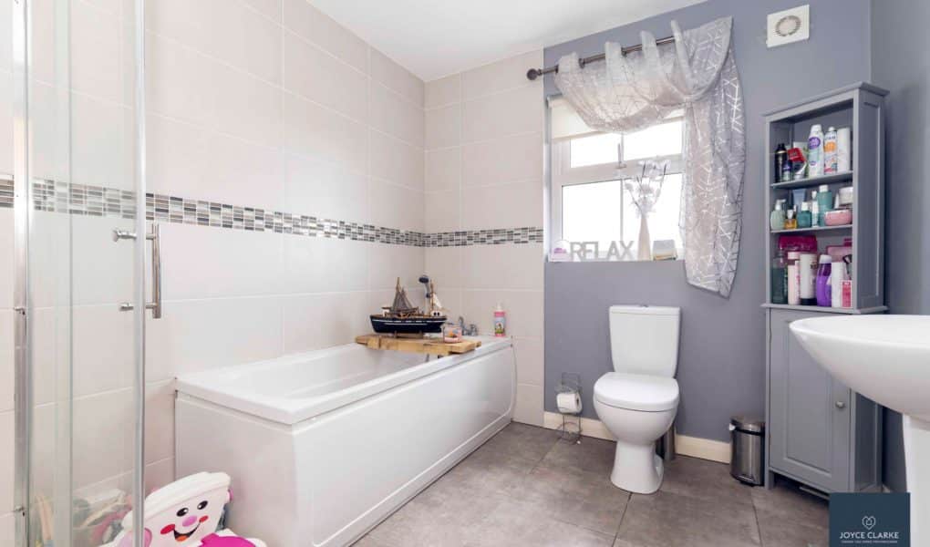 It offers four bedrooms, three of which are doubles, living room with ornate feature fireplace, open plan kitchen dining, family bathroom with separate shower and bath, and downstairs WC.