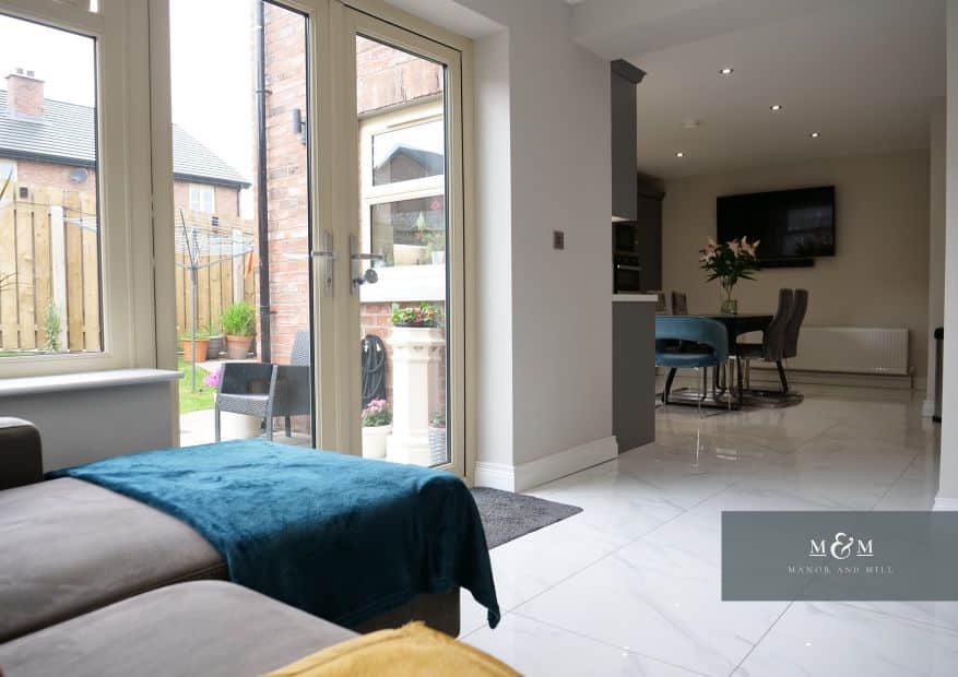 The stunning high shine tiles continue right throughout the ground floor and through to the open plan kitchen/dining and snug area. A spacious bright and airy kitchen with built in appliances, and modern units leads through to snug with feature wood burning stove and rear patio doors. A fully functional utility room also leads off from the kitchen and has a side access door.